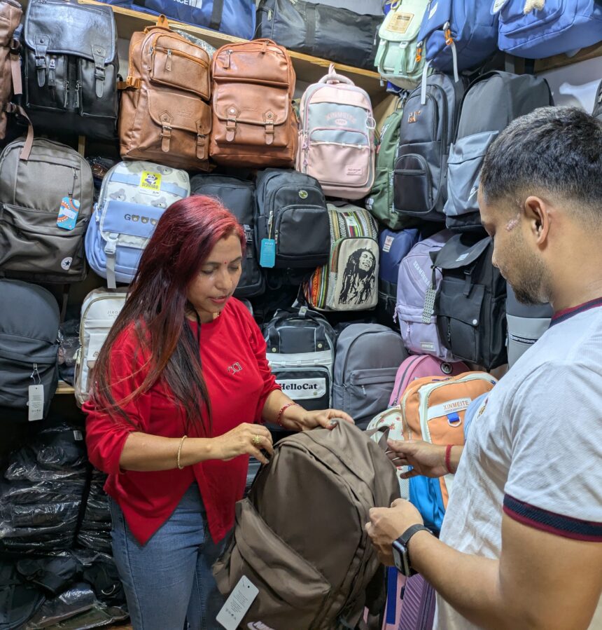 Manju Karki, a NEST central committee member, has been vending bags, shoes and other articles for 15 years. Her husband also has a stall; their children are 18 and 10. Manju, 42, says she likes being the “owner of my own work.”